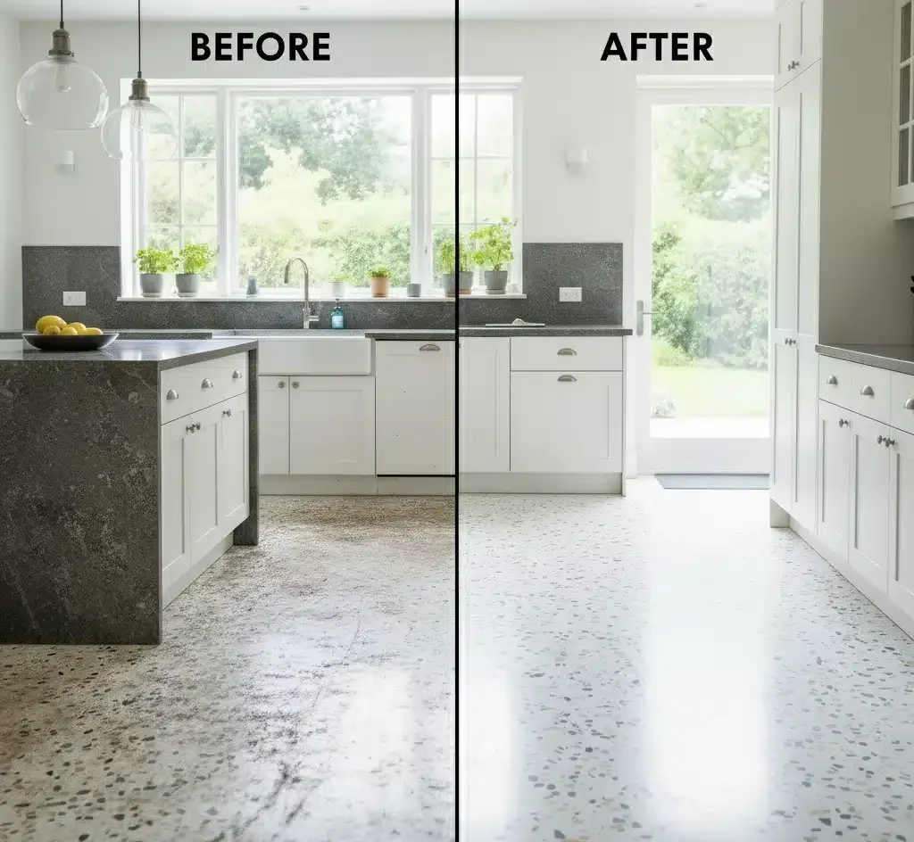 - Premium Sealing: After polishing, we apply a professional-grade terrazzo sealer. This penetrates the pores and forms an invisible protective layer, guarding the floor from future stains, spills and moisture. The right sealer makes daily cleaning easier and helps the floor stay beautiful longer.